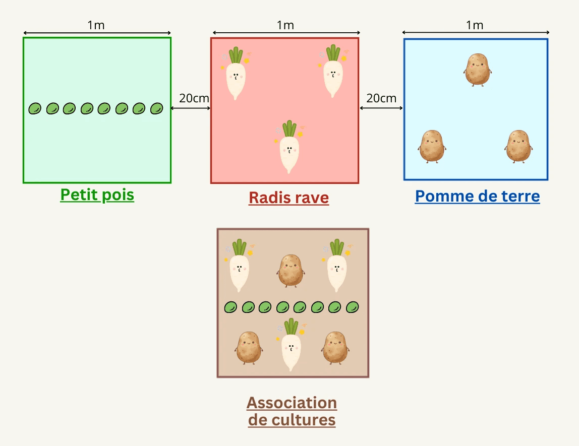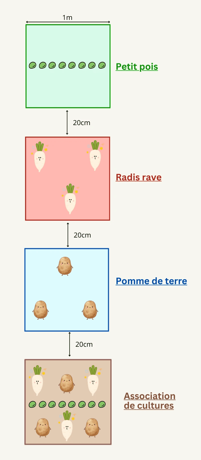 Après délibération des résultats en fonction de plusieurs critères (facilité de culture, complémentarité…) l'association de cultures qui a remporté leurs votes est la suivante : Petit pois - Radis rave - Pomme de terre.
